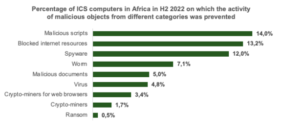 Other categories of malicious objects that were blocked on ICS computers in Africa include worms (7,1%), malicious documents (5%), viruses (4,8%).