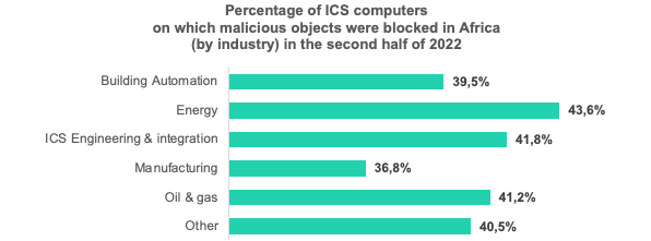 The situation with the number of attacks blocked varied across different industries. In Africa, the most targeted industries in the second half of 2022 were energy (in this sector attacks were blocked on 43,6% of ICS computers), engineering (41,8%), oil & gas (41,2%).