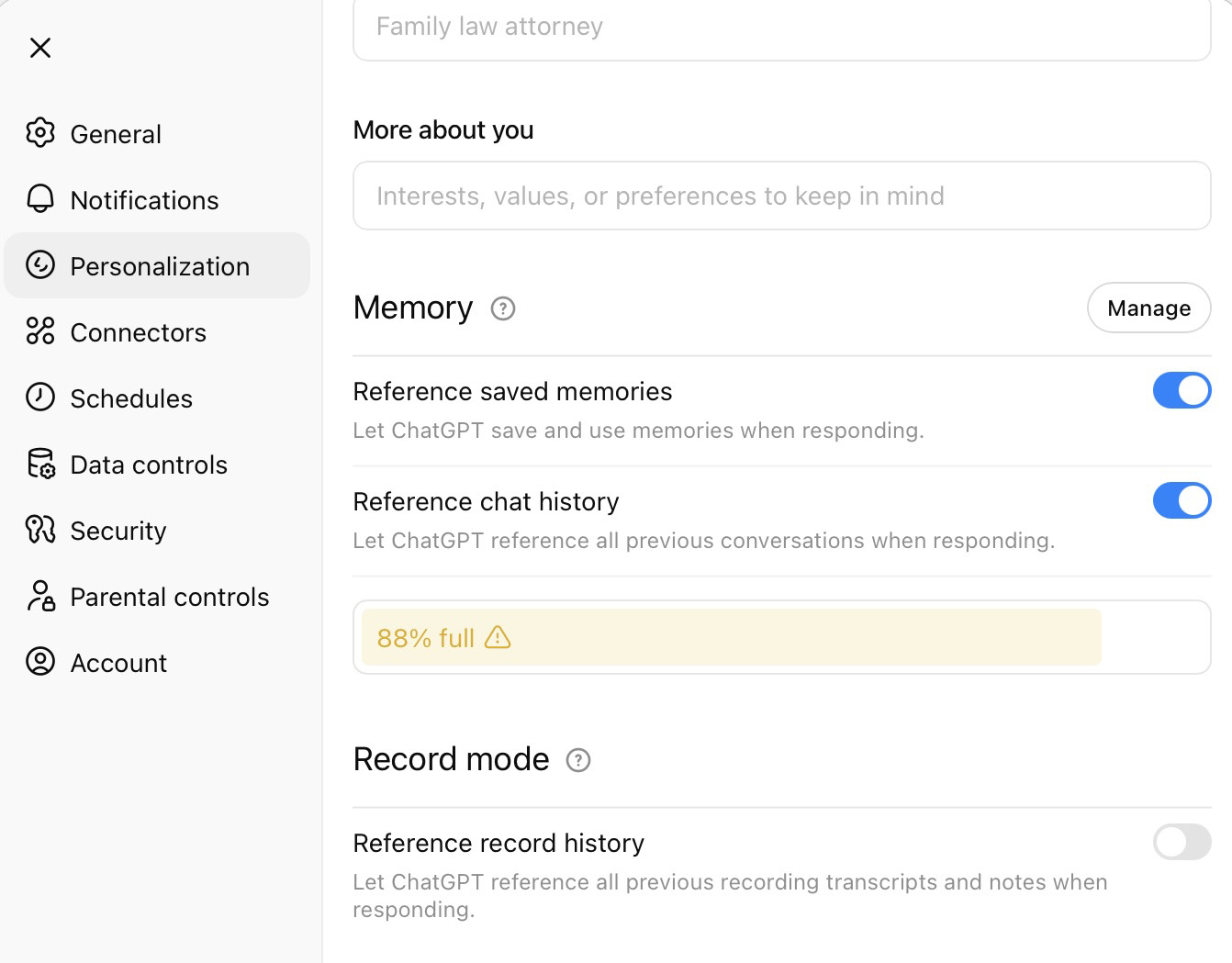 Another critical element of privacy protection is ChatGPT’s memory. Unlike chat history, memory allows the model to recall specific details about you, such as your name, interests, preferences, and communication style. This data persists across sessions and is used to personalize the AI’s responses.