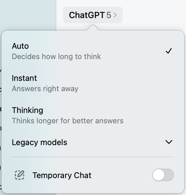 To activate a Temporary Chat in the ChatGPT applications for macOS and Windows, click the AI model selection, and a Temporary Chat toggle will appear at the bottom of the window that opens.