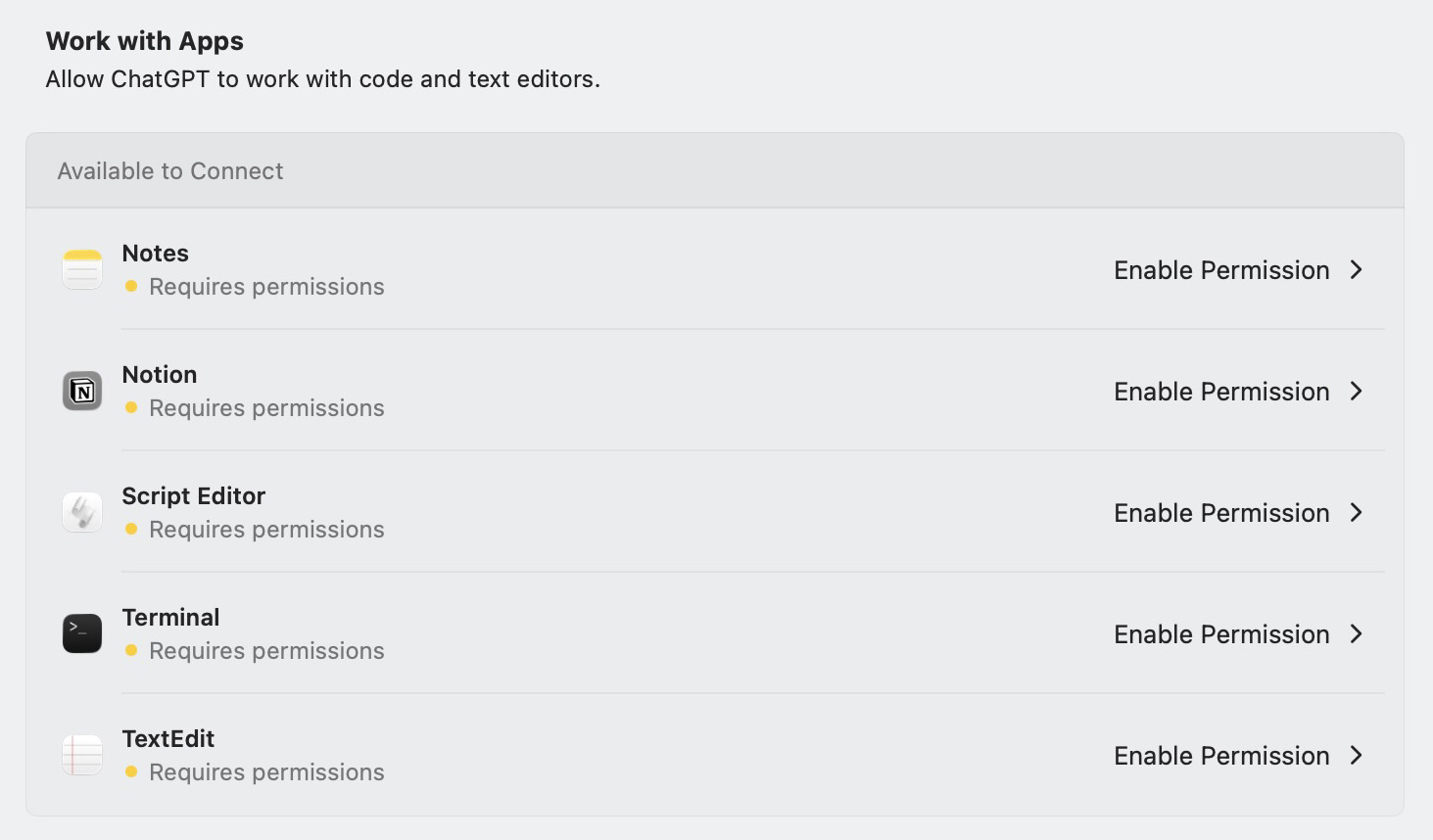 The ChatGPT application includes a feature named Work with Apps. This allows you to interact with the AI beyond the ChatGPT interface itself, extending its functionality into other apps on your device. Specifically, the model can connect to text editors and various development environments.