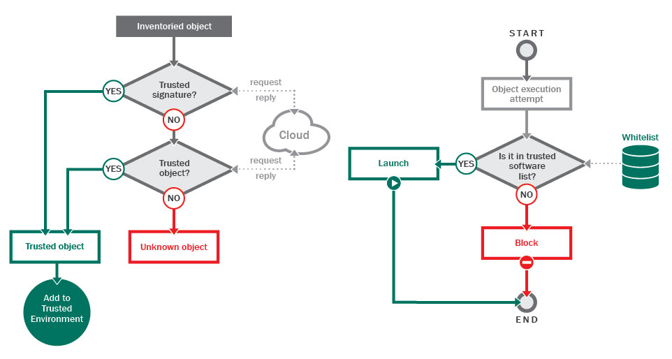 Again, I’ll use Kaspersky technology and industry terminology to explain how whitelisting works. In this case, we are talking about a process called “Default Deny.” Under this principle, a security product would block all applications and software by default unless they were explicitly allowed. Thus, you have a whitelist of pre-approved applications.